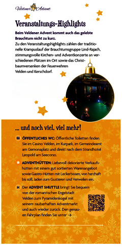 Mit dem neugestalteten Kinderadvent im Kurpark und einem einzigartigen neuen Lichtkonzept bringt der Veldener Advent in diesem Jahr nicht nur Kinderaugen zum Strahlen. Allerorts laden gemütliche Plätze mit lauschigen Feuerstellen zum Verweilen ein.